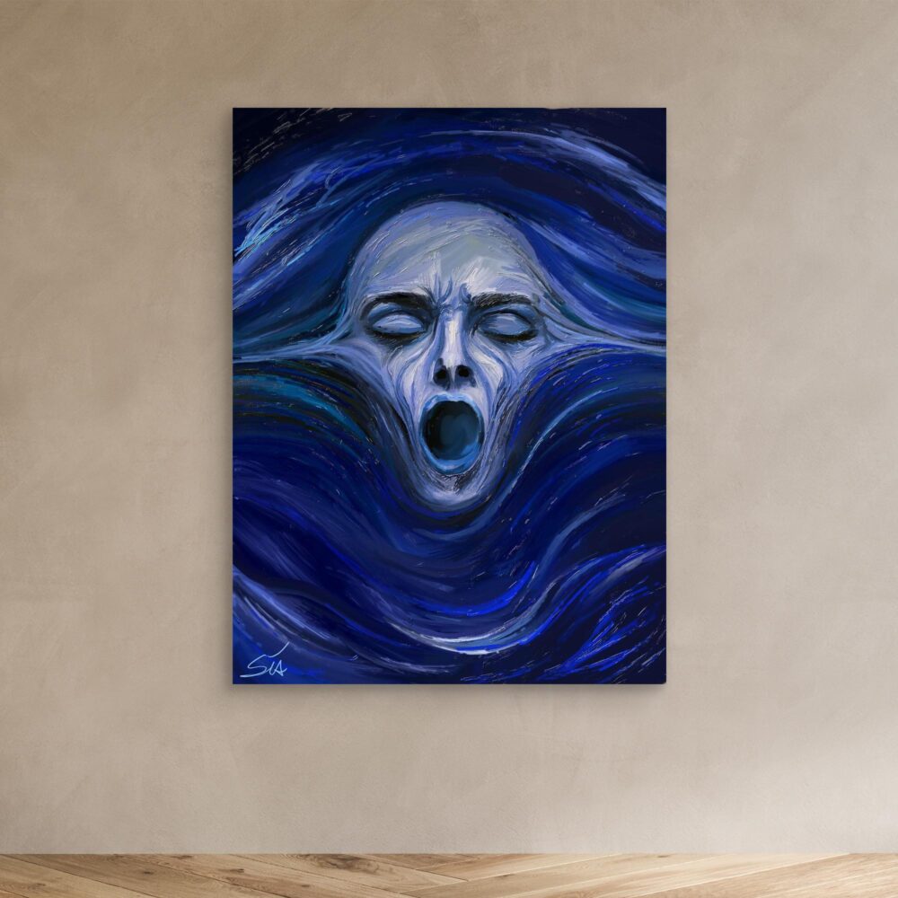 Zur Inspiration und dem Motiv: Die zentrale Inspiration ist der stille Schrei – der Moment, in dem die innere Spannung so überwältigend wird, dass sie die starre Form der Selbstkontrolle durchbricht. Das Motiv des Gesichts ist dabei bewusst verzerrt und fragmentiert, ganz im Sinne des Expressionismus. Die geschlossenen Augen deuten auf eine tiefe Innenschau und Kontemplation hin, während der geöffnete Mund und die fließenden Konturen den Verlust der Kontrolle und das Herausschwappen innerer Turbulenzen visualisieren. Es ist eine kraftvolle Reflexion über Ausdauer und die Unvermeidbarkeit, das wahre Innere preiszugeben.